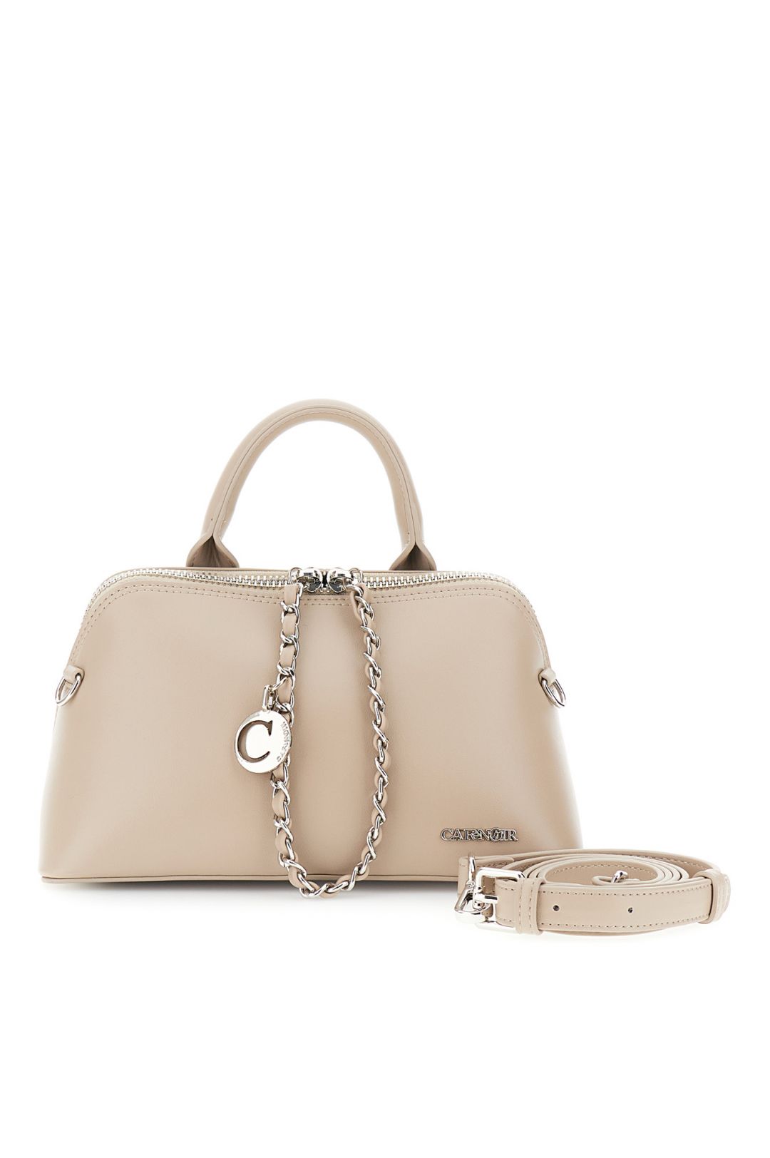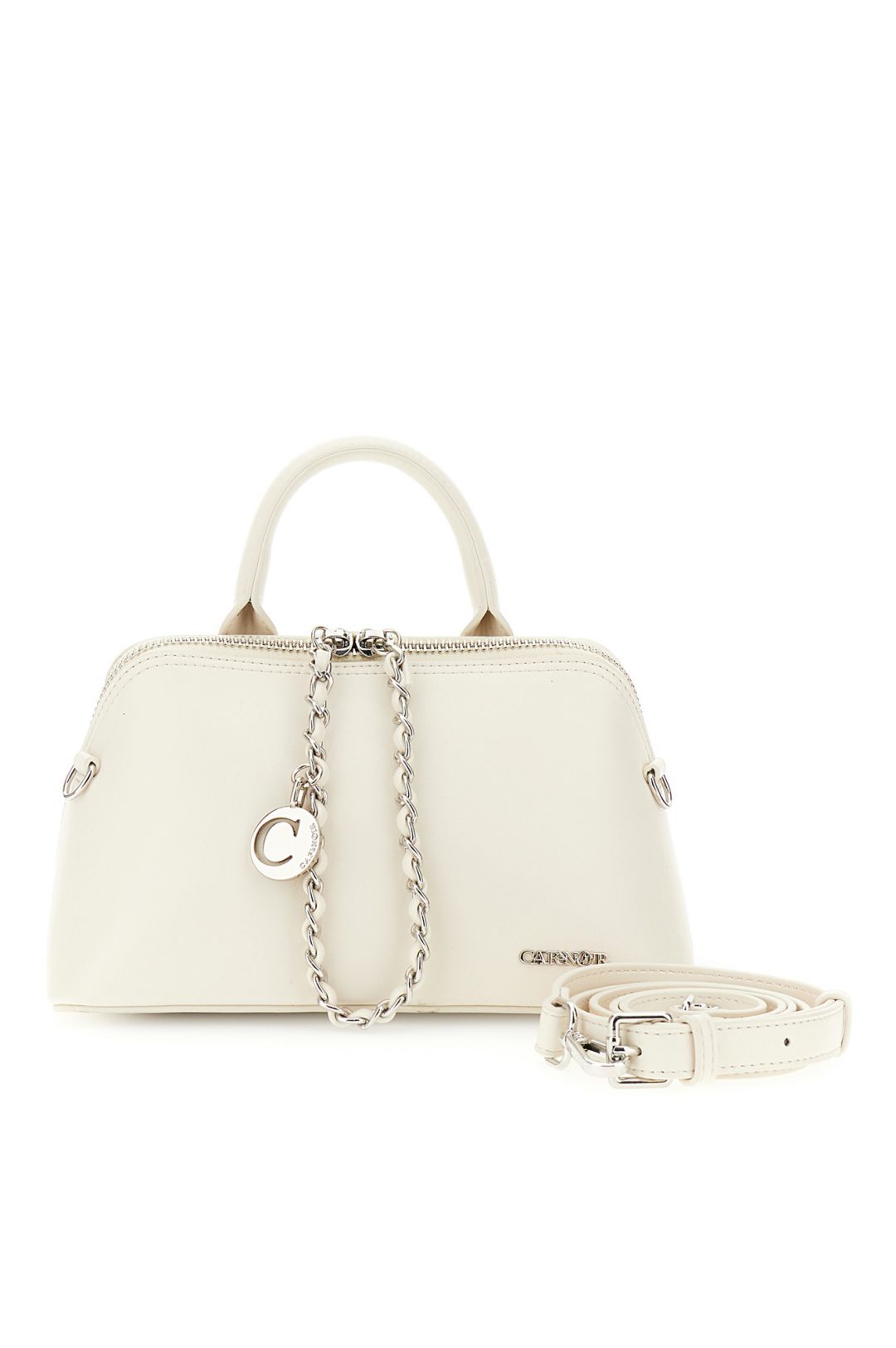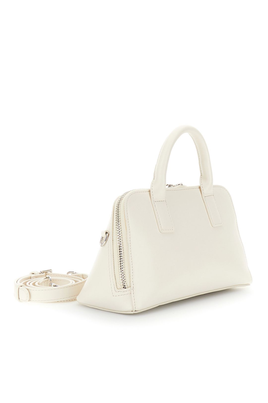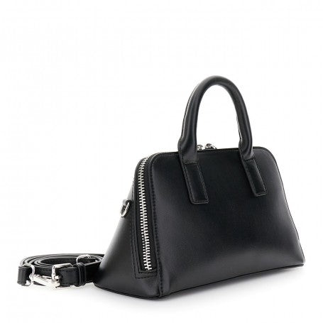 Borsa a mano dalla forma trapezioidale in similpelle con zip a vista catena decorativa e charm metallico. dotata di tracolla removibile regolabile.