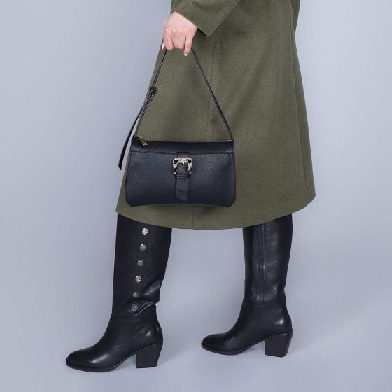 Borsa a spalla in similpelle con tasca sul davanti e fibbia gioiello. costole a contrasto e tramezze interne. tracolla regolabile e tracollina removibile. Colore Nero - Codice C3NG0918 - Chiusura Cerniera - Materiale Esterno sintetico - Interni: TASCHINO INTERNO CON ZIP 17 cm, TASCHINO APERTO. Altezza:160mm - Larghezza:240mm - Profondita:80mm - Lunghezza Tracolla:1200mm - Luce Manici:260mm.