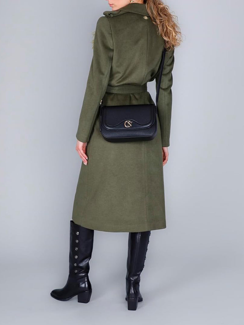 La borsa CafèNoir con codice articolo MA0906 è una borsa a tracolla da donna in ecopelle con effetto pelle granosa. È caratterizzata da una pattina sagomata, una cornice imbottita e il logo CafèNoir in metallo.