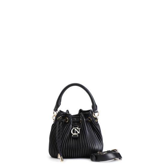 Secchiello con coulisse in materiale metallizzato plissè con dettaglio logo in metallo con strass. tracolla removibile. Codice C3WA0701. Chiusura Coulisse - Calamita. Materiale Esterno sintetico. Interni: Tasca con zip 15 cm + tasca aperta 13 cm.