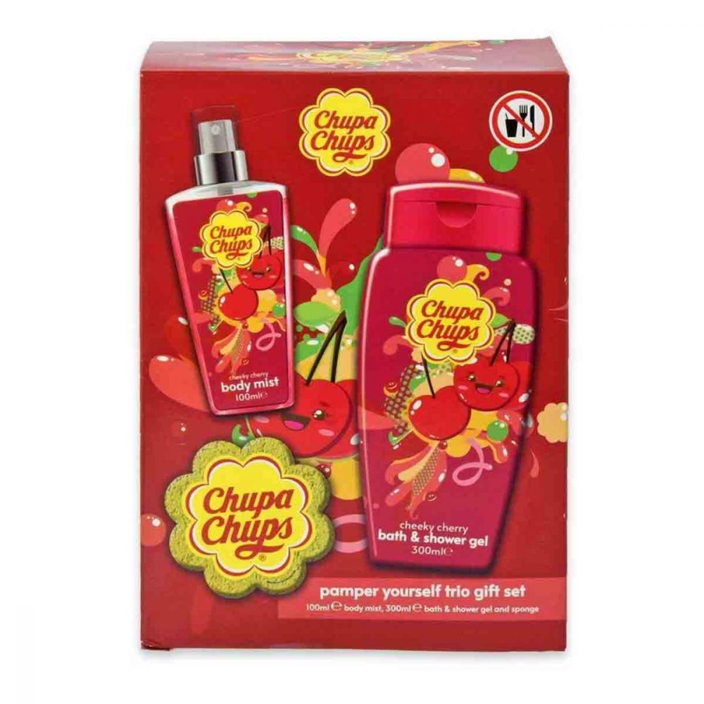 La confezione regalo Chupa Chups Cheeky Cherry include un gel doccia da 300 ml e un'acqua profumata (body mist) da 100 ml, accompagnati da una spugna abbinata. I prodotti hanno una dolce e fruttata profumazione alla ciliegia, ispirata al lecca-lecca omonimo.