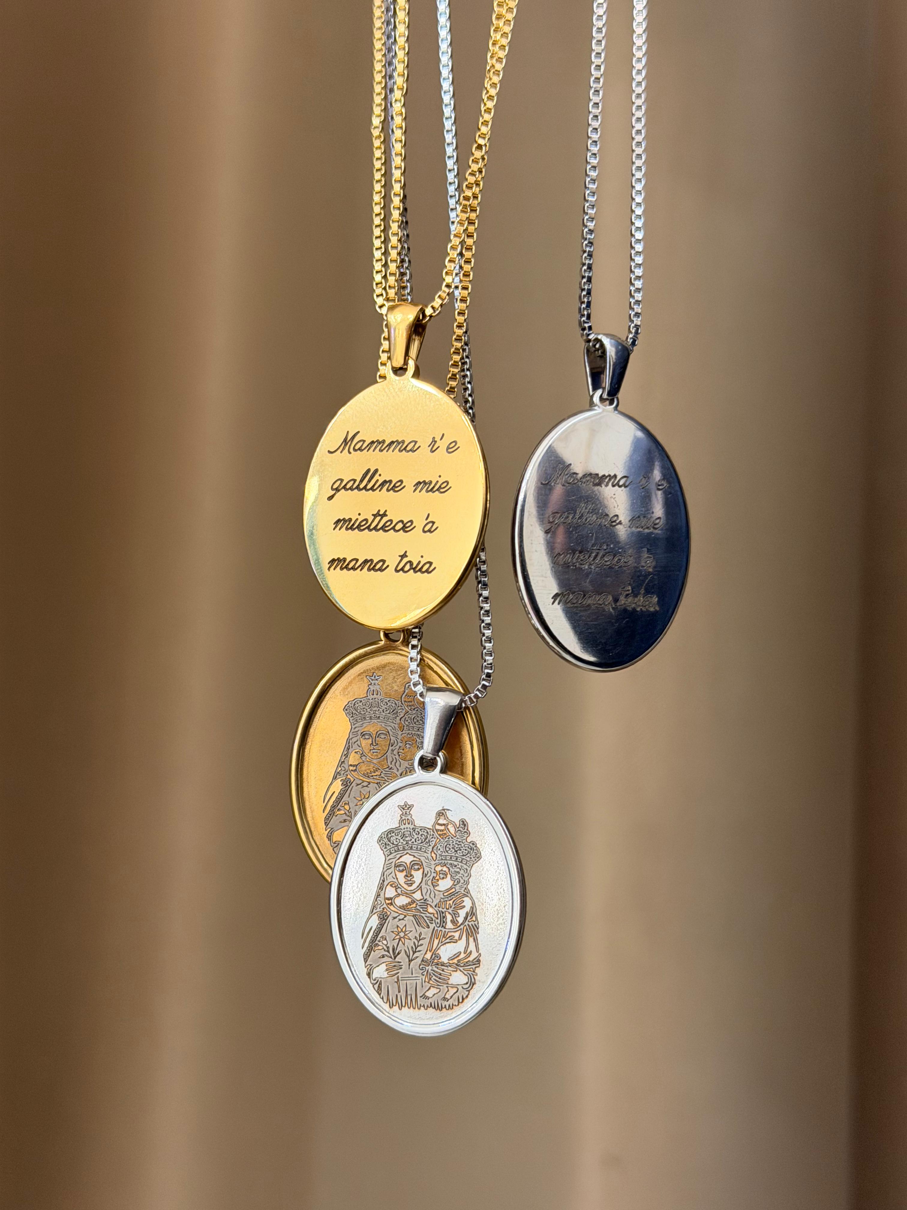 COLLANA IN ACCIAIO COLORE ORO CON INCISIONE MADONNA DELLE GALLINE E RETRO CON INCISIONE Mamma re galline mie mettiece a mana toia