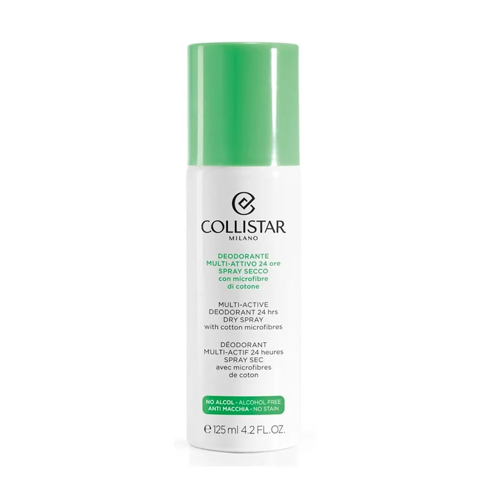 Collistar Deodorante Multi-attivo 24h Spray Secco 125ml è uno spray fresco e delicatamente profumato arricchito con speciali fibre di cotone ultra-micronizzate dal forte potere assorbente. Asciuga subito lasciando la pelle fresca, morbida e setosa.