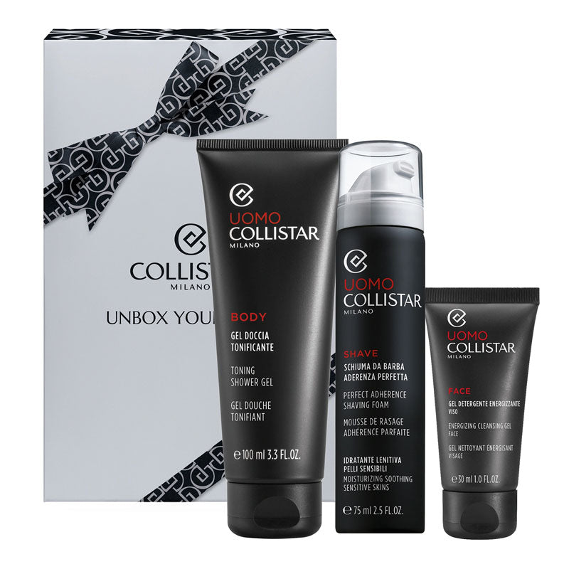 Cofanetto uomo COLLISTAR LINEA UOMO gel doccia 100ml + schiuma da barba 75ml + gel detergente viso 30ml.