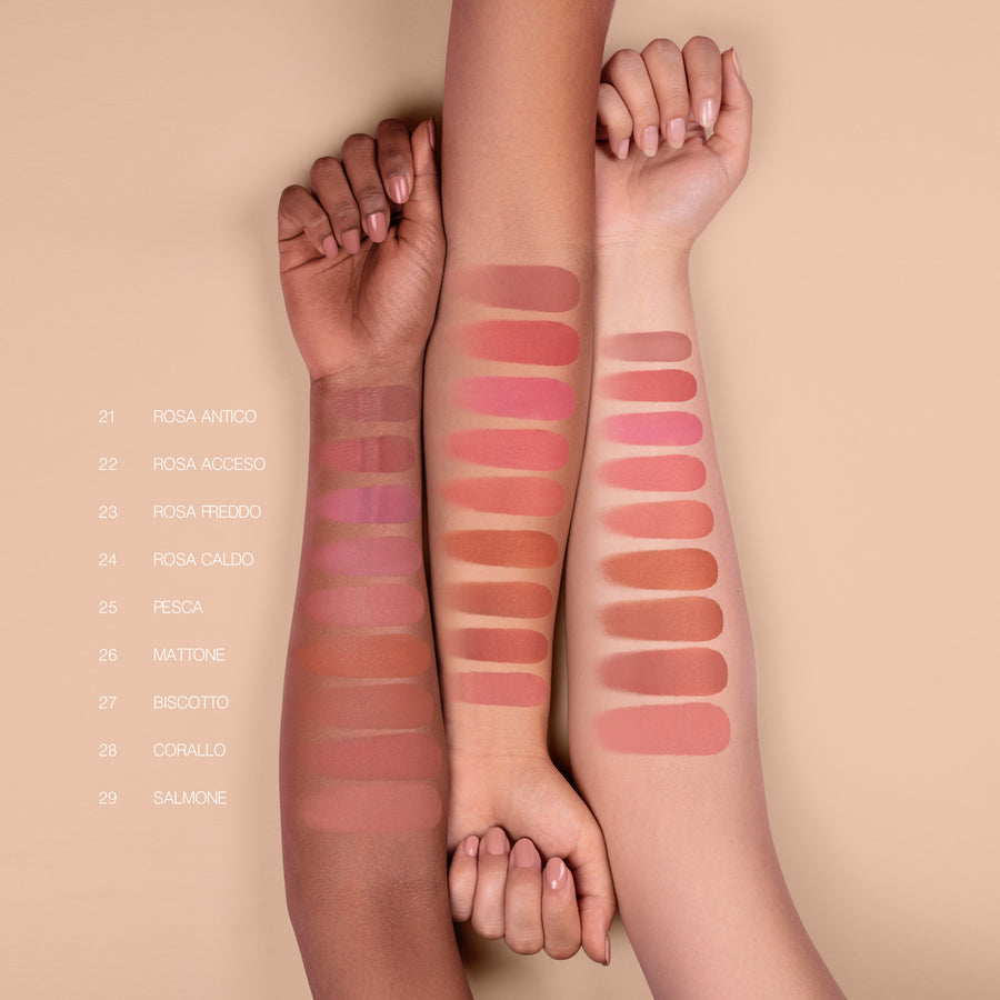 Una nuova gamma di blush in polvere dalla texture impalpabile morbida e setosa. Una polvere finemente micronizzata, facilmente sfumabile e modulabile. Il rilascio colore è graduale grazie alla polvere finemente micronizzata e che consente di modulare l'intensità del colore. Le guance appaiono vellutate e vivacizzate, dall'aspetto sano.