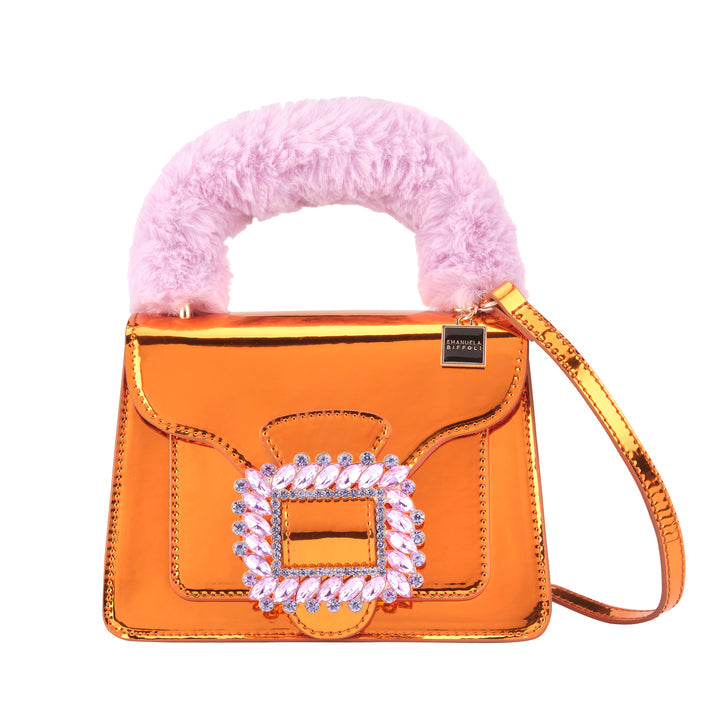 Questa borsa a mano gioiello arancione metallizzata con dettagli glamour è perfetta per chi vuole distinguersi con stile. Il manico in eco-pelliccia lilla offre un tocco di morbidezza e comfort, creando un contrasto sorprendente con il finish lucido del corpo della borsa. Il punto focale è la fibbia gioiello tempestata di cristalli lilla, che aggiunge un elemento di lusso e raffinatezza. Dotata di tracolla rimovibile, questa borsa è ideale sia per eventi eleganti che per dare un tocco chic agli outfit quotidiani. Un accessorio audace e versatile, pensato per chi ama osare con la moda.