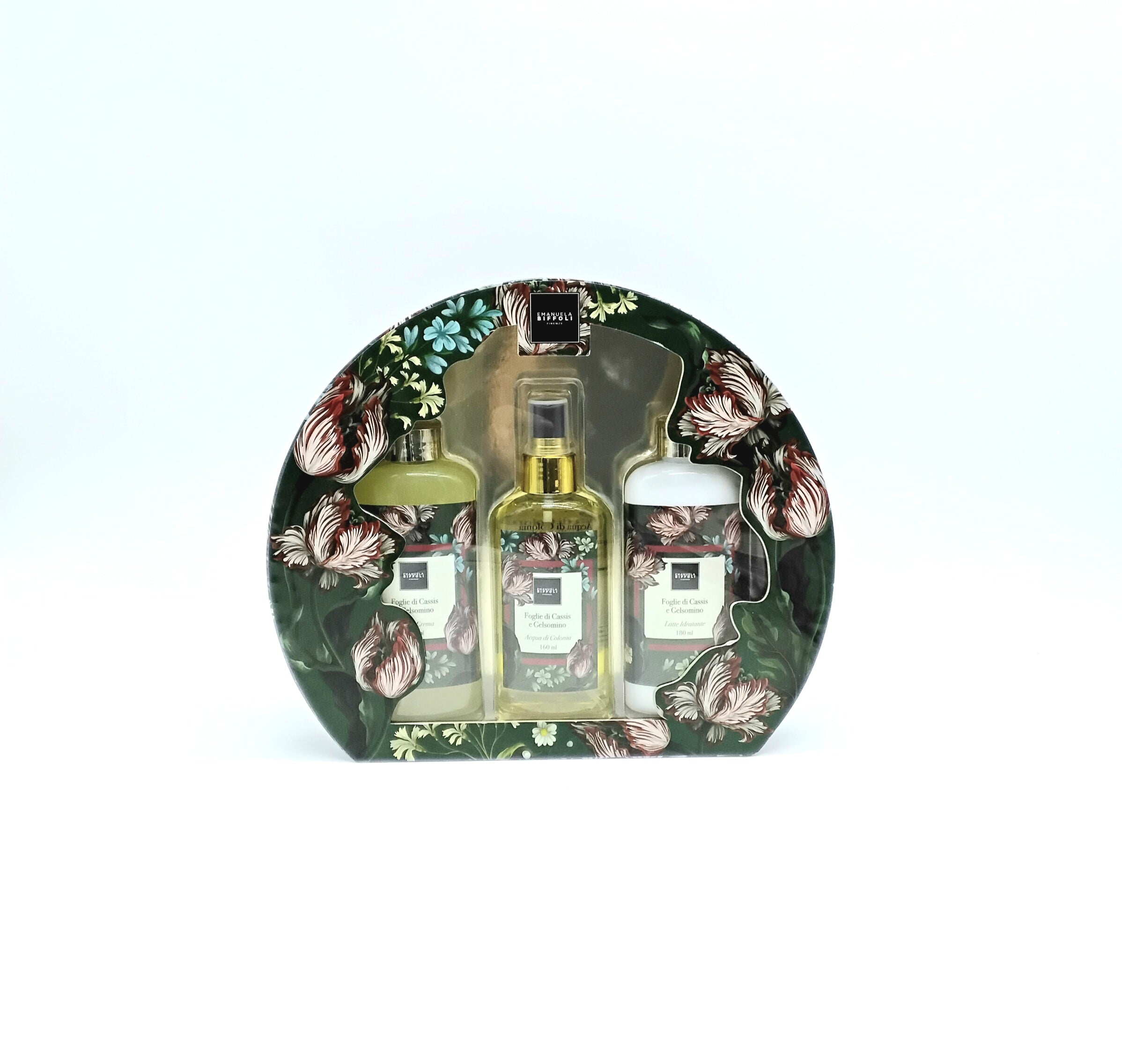 Elegante cofanetto regalo di Emanuela Biffoli, contiene due flaconi da 180 ml di latte idratante e bagno crema, e un'Acqua di Colonia di 160 ml, dall'intenso profumo di foglie di Cassis e gelsomino, adatto ad ogni tipologia di pelle, per una sensazione di intensa freschezza sulla pelle.