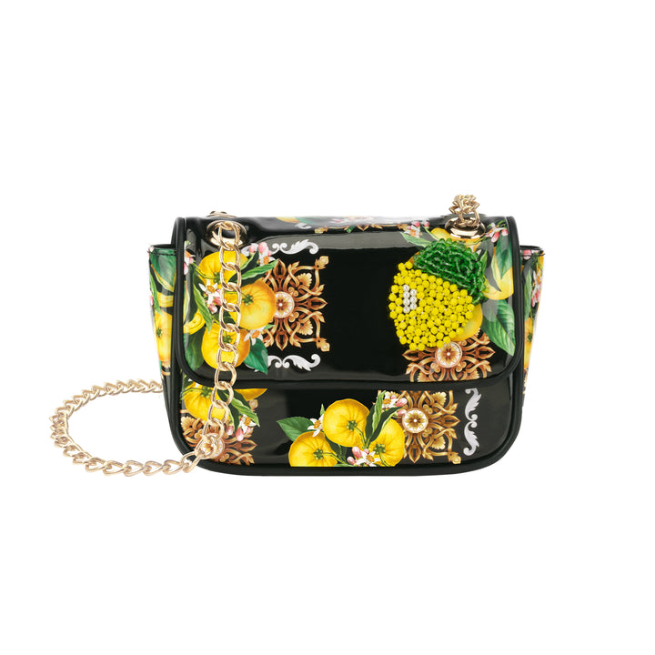 Esplora lo stile unico con EmiBag "Dolce Vita" in PVC lucido con stampa esclusiva "Dolce Vita", dettagli raffinati in eco-pelle nera e applicazione gioiello limone con strass. Godi di versatilità con la tracolla dotata di catena dorata (lunghezza 100 cm) e la praticità della tasca esterna piatta sul retro con chiusura a clip. La Targhetta quadrata in metallo dorato con il logo EmiBag aggiunge un tocco di eleganza.