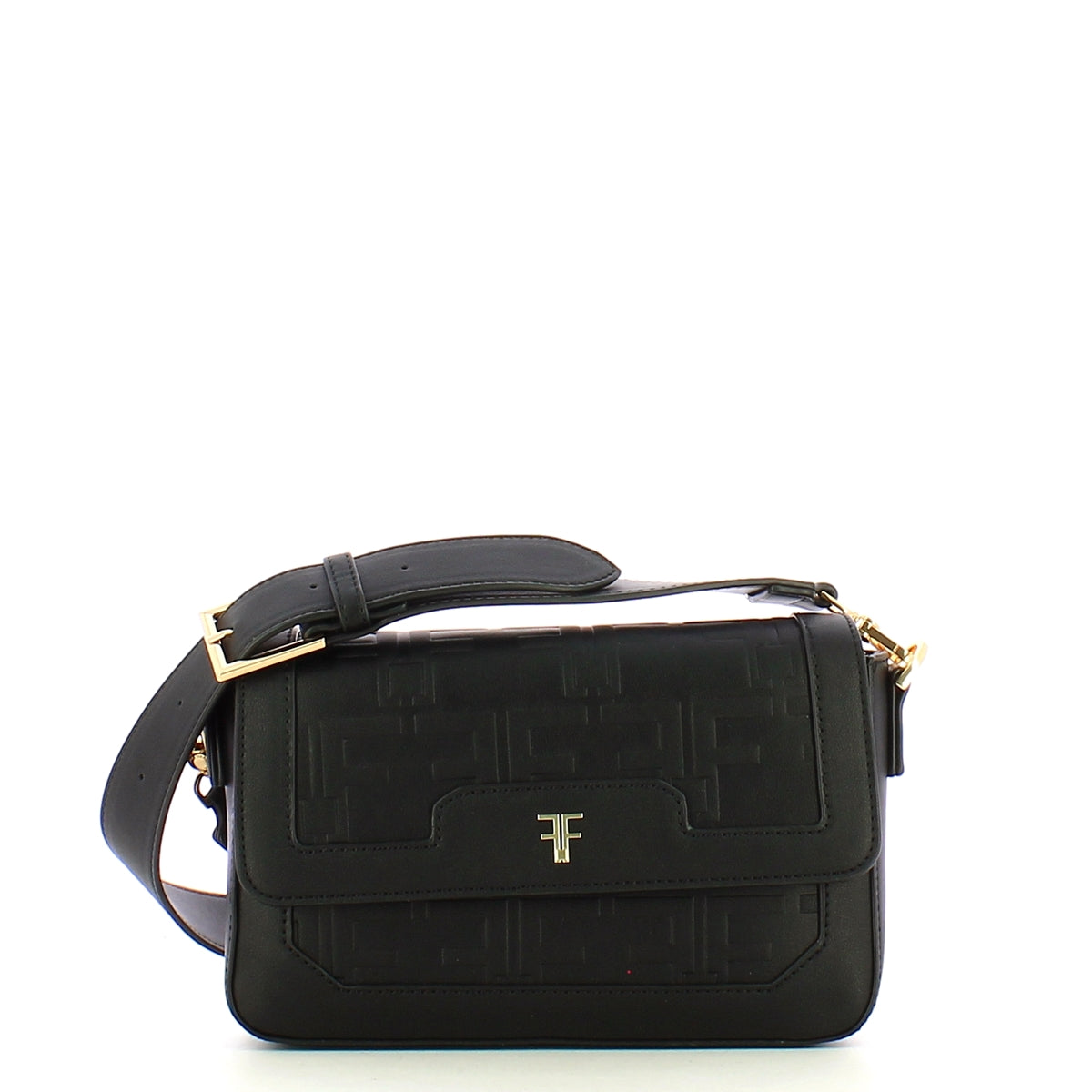 Borsa a tracolla logata Black Fracomina, compatta e funzionale borsa a bandoliera n similpelle, con motivo logato embossed. Comoda tracolla larga, regolabile e removibile. Comparto con chiusura con patta e interno foderato.