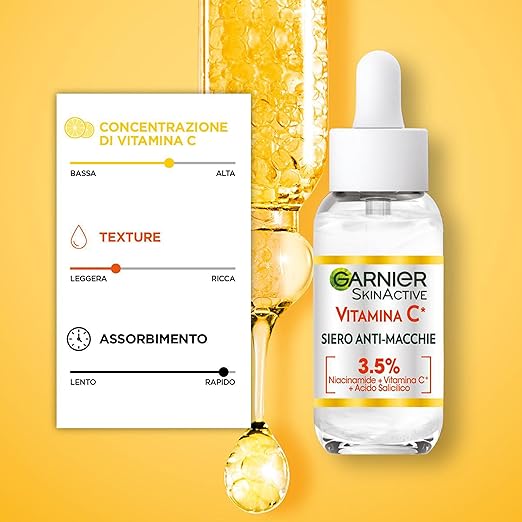 Cosa fa per la mia pelle? Il nostro primo siero concentrato con una potente formula di 3,5% [Niacinamide + Vitamina C* + Acido Salicilico], per ridurre l`aspetto delle macchie scure a partire da 6 giorni e aumentare la luminosità delle pelle! La scienza in questo siero 3,5% [Niacinamide + Vitamina C* + Acido Salicilico] Formulato con potenti dermoattivi conosciuti per ridurre l`aspetto delle macchie e aumentare la luminosità della pelle. *Vitamina C = Derivato di Vitamina C [Estratto di Limone] Un potente super food riconosciuto per le sue proprietà illuminanti.