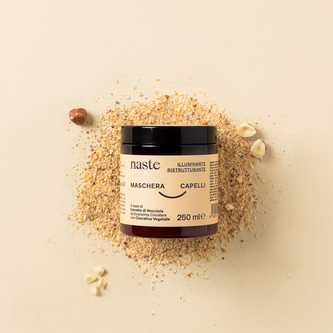 NASTE beauty ha formulato la prima linea per capelli da economia circolare. Abbiamo studiato la nocciola nella sua interezza, arrivando a creare un estratto di nocciola derivato dalla lavorazione della farina disoleata del frutto: una componente normalmente scartata ed inutilizzata, sotto-prodotto ottenuto dall’olio di nocciola. La maschera capelli è cremosa e a base di olio di jojoba e mandorla biologici che donano morbidezza e lucentezza al capello.