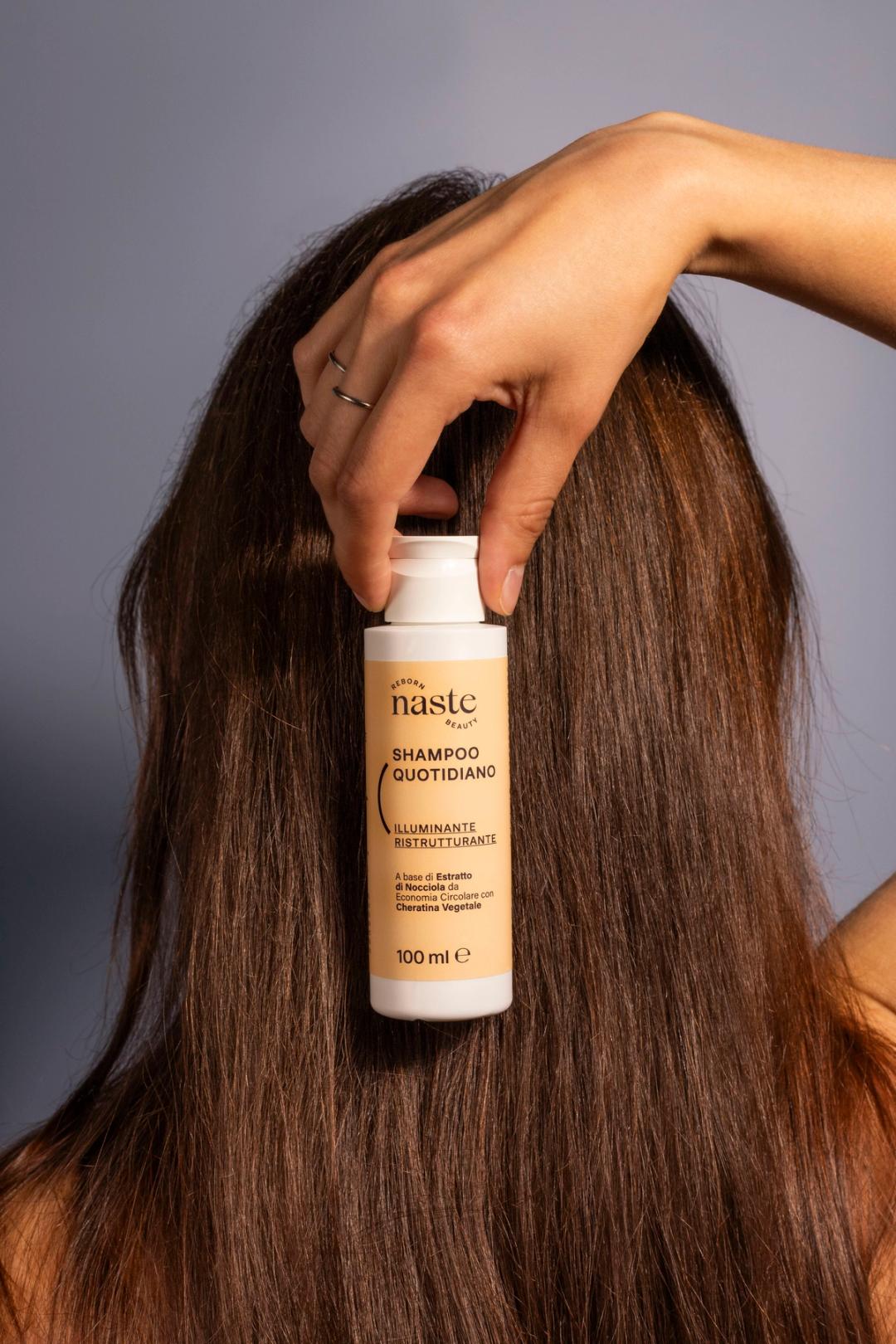 Shampoo quotidiano illuminante e ristrutturante a base di estratto di nocciola da economia circolare formulato con cheratina vegetale e principi attivi di ottima qualità adatti a tutti i tipi di capelli.