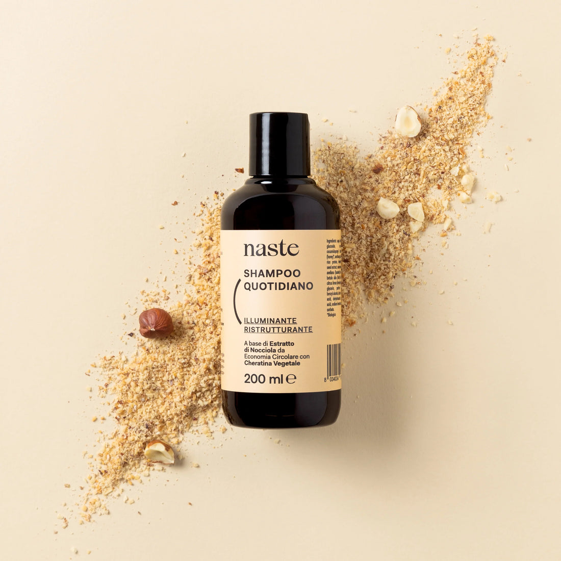 NASTE Shampoo Quotidiano Illuminante Ristrutturante 200ml. Shampoo quotidiano illuminante e ristrutturante a base di estratto di nocciola da economia circolare, adatto a tutti i tipi di capelli.