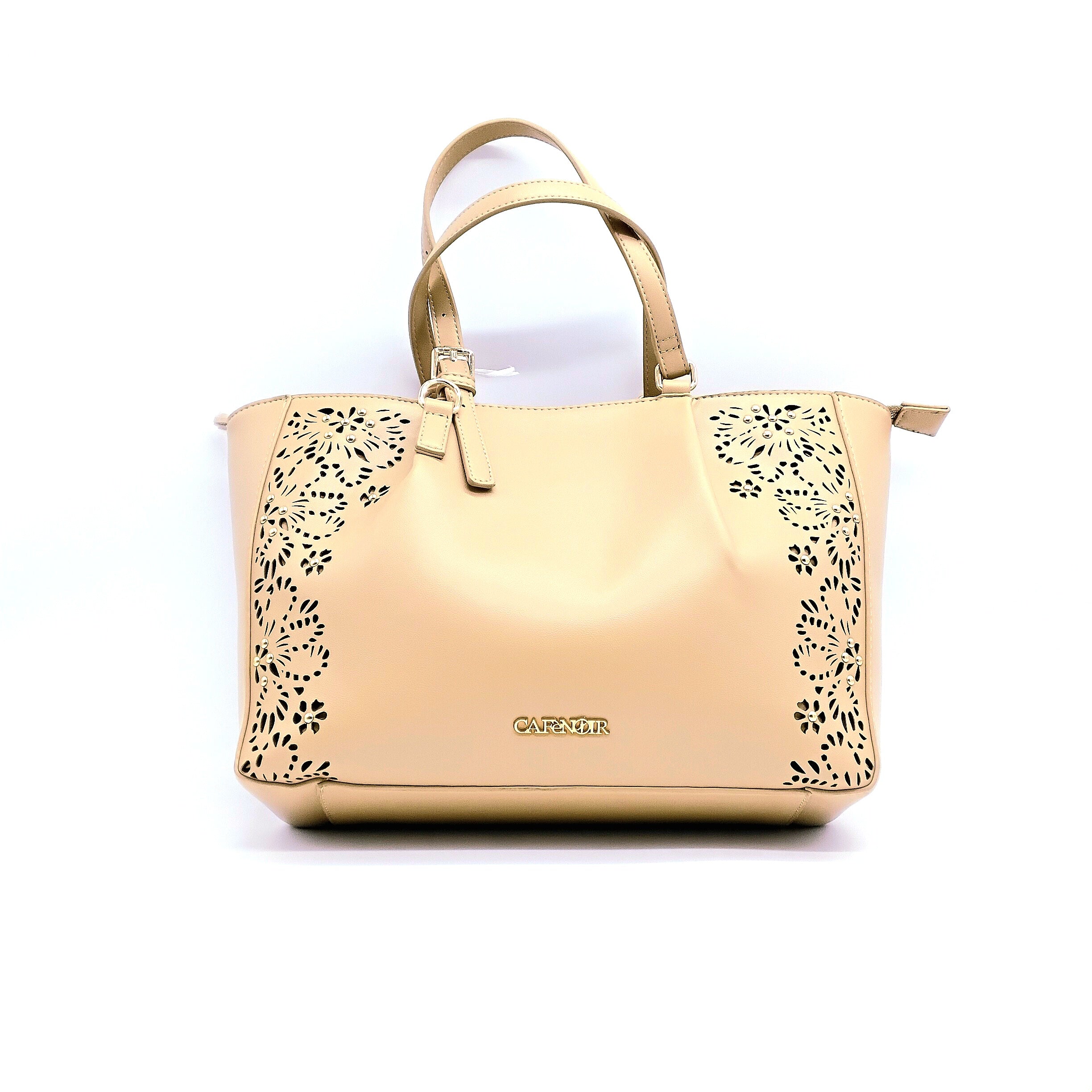 Shopping in materiale effetto pelle decorata con motivo floreale laserato e rivetti dotata di manici regolabili con fibbia e tracolla removibile per massima versatilità. Codice C3ND0824, Chiusura Cerniera, Materiale Esterno sintetico, Interni: TASCHINO CON ZIP 18 cm + TASCHINO APERTO 18 cm, Altezza:220mm - Larghezza:360mm - Profondita:80mm - Lunghezza Tracolla:1200mm - Luce Manici:130mm.