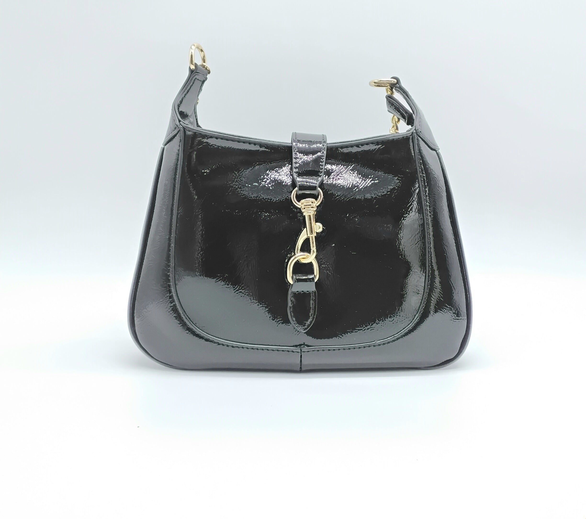 Borsa con tracolla e chiusura a gancio. Effetto lucido. Colore: Nero.