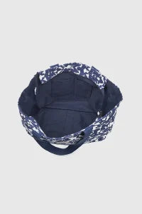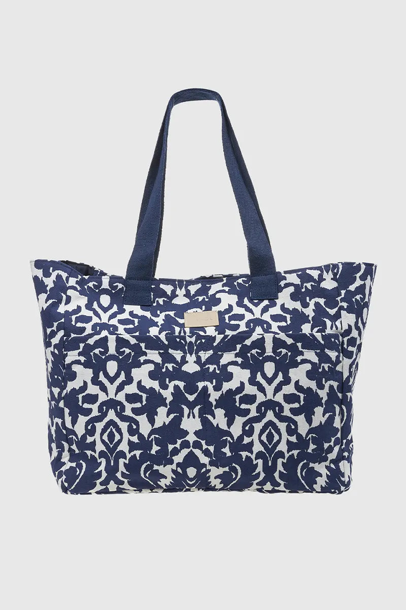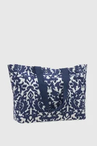 Borsa mare Verde Fashion con raffinata stampa cachemire stilizzata in blu navy e bianco. Ampio scomparto principale per teli e accessori. Dotata di robusti manici lunghi in cotone blu navy per un comodo trasporto a spalla e due pratiche tasche frontali applicate per tenere a portata di mano piccoli oggetti. Realizzata in resistente cotone, è la compagna ideale per le tue giornate in spiaggia o a bordo piscina con un tocco di eleganza classica.