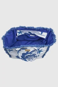 Ampia borsa mare in cotone con vivace stampa di coralli, stelle marine e onde nei toni del blu su sfondo bianco. Chiusura superiore con zip per sicurezza. Tasche interne per organizzare piccoli oggetti. Comodi manici in tessuto con stampa coordinata per trasporto a spalla. Bordi decorati con frange blu. Ideale per la spiaggia e la piscina.