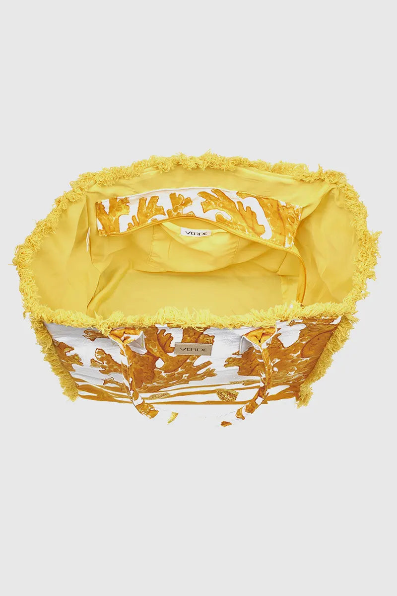 Ampia borsa mare in cotone con vivace stampa di coralli, stelle marine e onde nei toni dell’ocra su sfondo bianco. Chiusura superiore con zip per sicurezza. Tasche interne per organizzare piccoli oggetti. Comodi manici in tessuto con stampa coordinata per trasporto a spalla. Bordi decorati con frange ocra. Ideale per la spiaggia e la piscina.