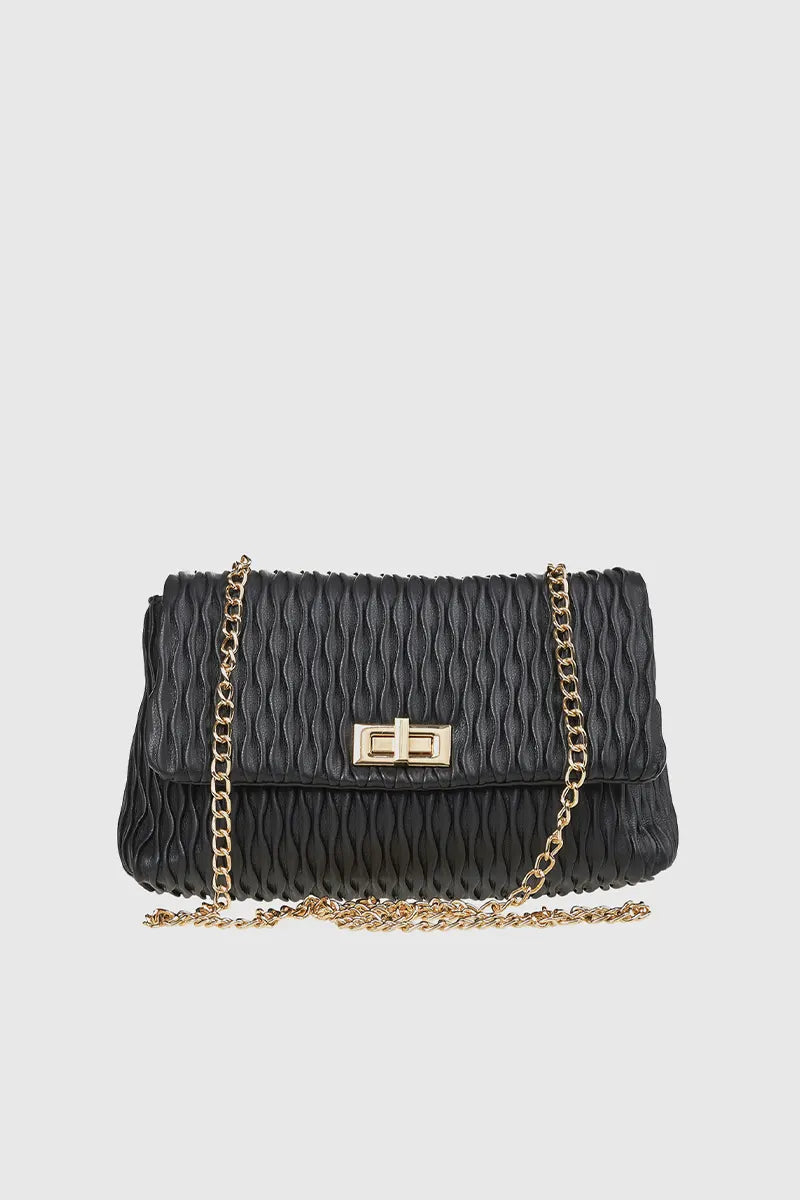 Pochette in ecopelle con trama ondulata, impreziosita da una pattina frontale e una tracolla a catena.