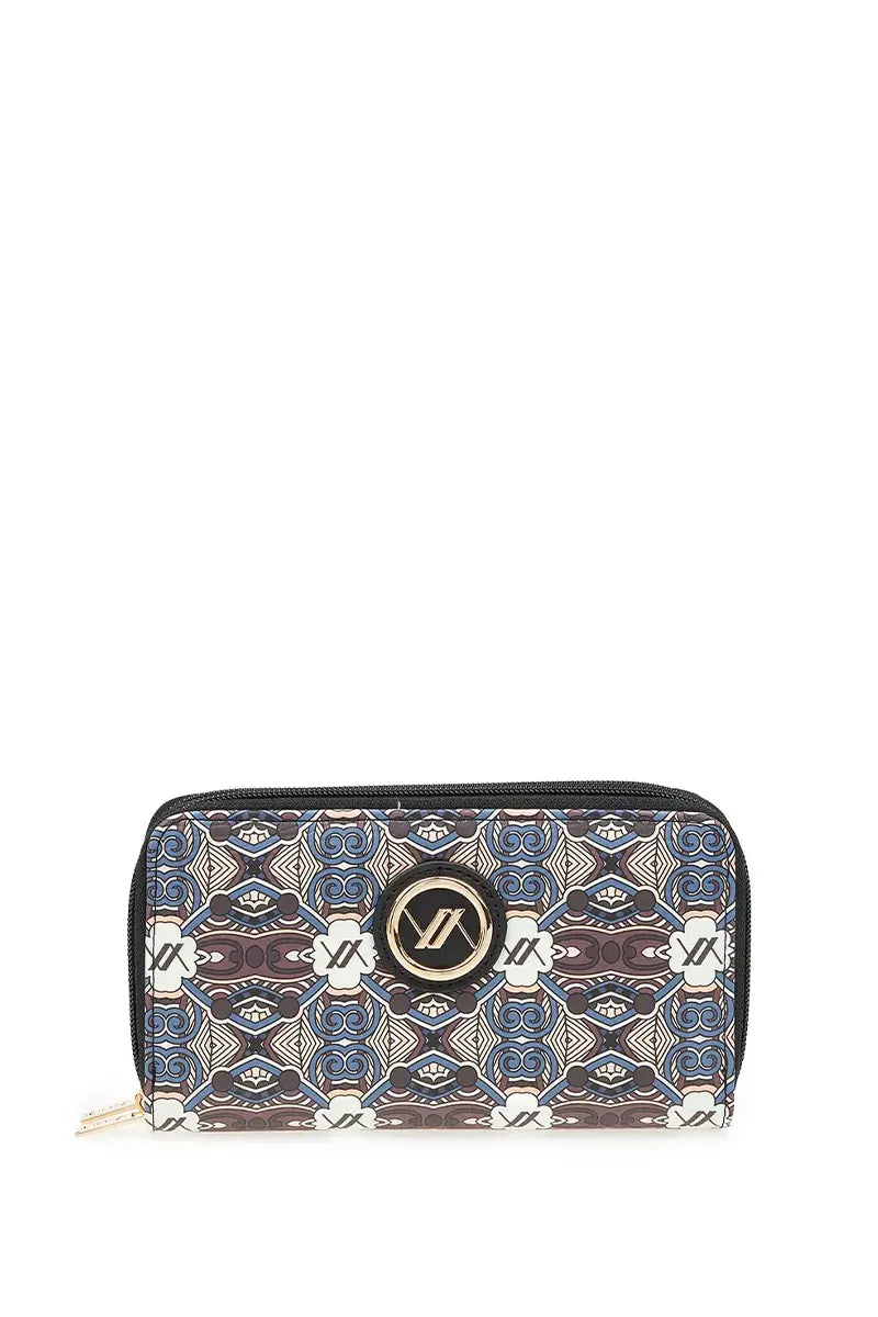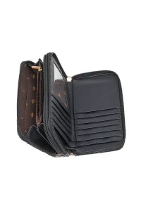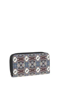 Portafoglio in ecopelle a fantasia con apertura a cerniera, interno diviso in due scomparti, dotato di tasca interna divisa e portamonete con chiusura a zip. Dispone inoltre di otto tasche per carte, una tasca per le banconote e di una tasca per documenti.